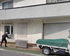 ペイントホームズ佐世保店では、まず周囲への水ハネを防ぐために養生を行い、外壁だけでなく床・看板・出入口まわりまで丁寧に洗浄を実施。