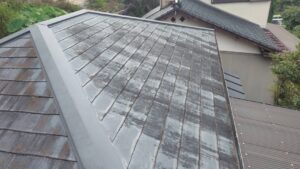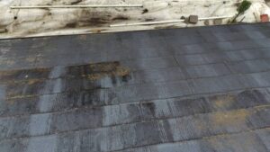 屋根を確認すると、大きな割れや欠損はありませんでしたが、全体的に色あせが進み、日当たりの悪い部分にはコケや黒ずみが見られる状態でした。